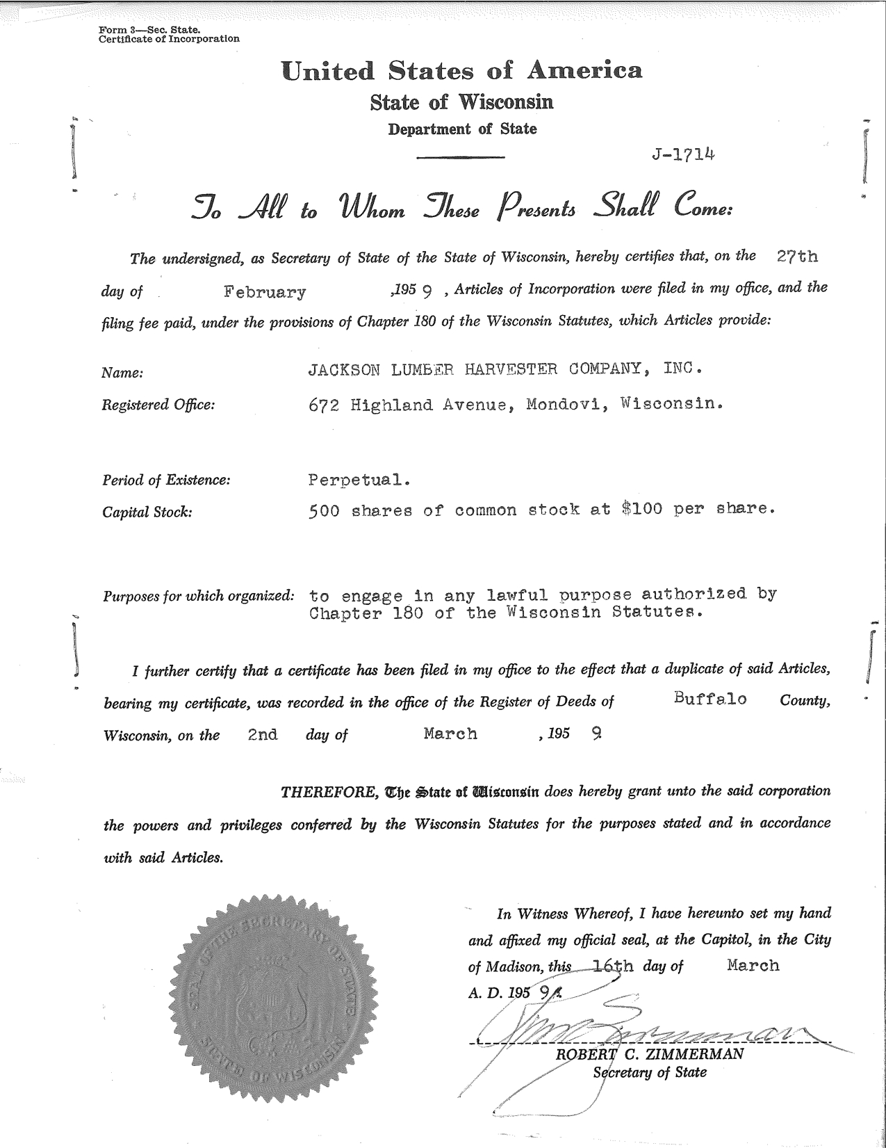 The first manufacturing was carried out in Clint's blacksmith shop in Mondovi. However, demand quickly outpaced production; so "Lumber Harvesters" began being manufactured under contract by the Phoenix Manufacturing Division of the W. H. Hobbs Supply Company in Eau Claire (later Phoenix Steel Corp., then PDM Bridge, now Veritas Steel). The Wisconsin corporation "Jackson Lumber Harvester Inc." was created, with offices on the second floor above OK Rubber Welders at 423 Wisconsin St., Eau Claire, WI (later Hagen's OK Tire Store). Approximately 56 "Lumber Harvesters" were manufactured in these early years.